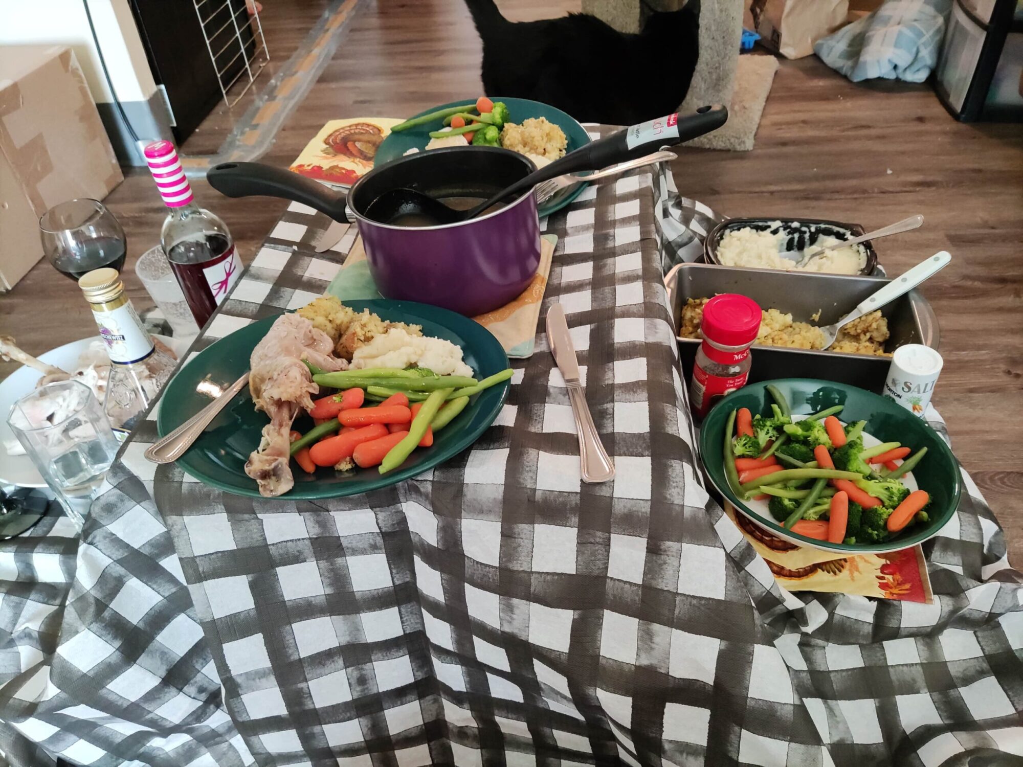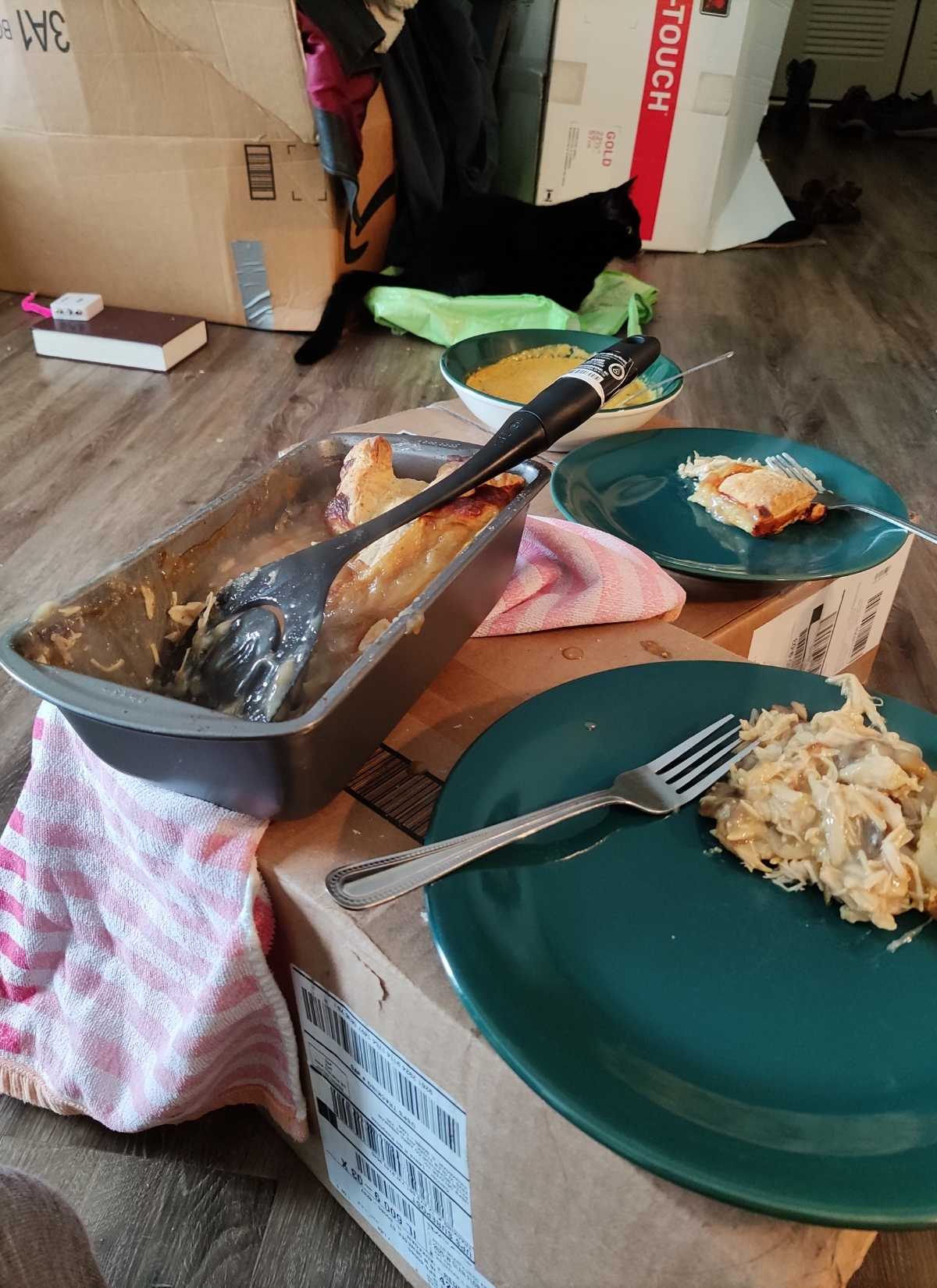 Paul & Anne* went on to share: “I’m not much of a photographer, but we thought you’d like to see our cat feigning indifference towards the turkey dinner, as well as the turkey and gravy pie we made with the leftovers.” Notice the Bible in the picture with the cat? That was a gift that our Starter Kit delivery volunteers shared with them!