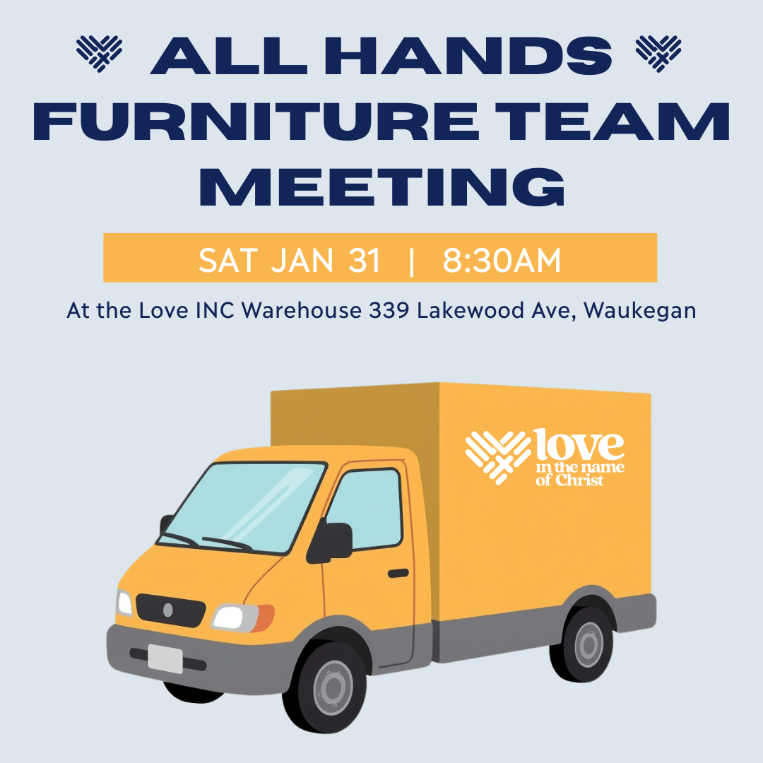 Do you currently serve on a furniture team? Have you served in the past and want to get reconnected? New to the furniture ministry & want to know what it’s all about? Join us for an All Hands Furniture Team meeting as we kick off the new year – learning how the furniture ministry fits into Love INC’s overall mission and collaborating on how we can continue to serve better.